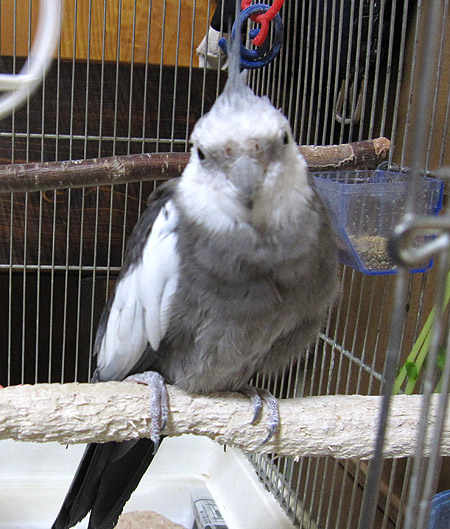ほっぺがうっすらとオレンジ色なのがわかりますか?「パステルフェイス」といって、ちょっと変わり種なのです。「ななちゃん」はもっと濃いオレンジでした。あっちが本来のオカメちゃんのほっぺです。ちなみに「はなちゃん」は「ホワイトフェイス」といってやっぱり変わり種です。