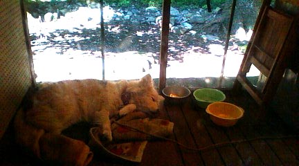 ちなみにお犬様のおはします向こう側には蚊よけの網を張っております。冬は風よけの厚手ビニールを張ります。