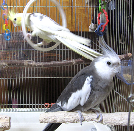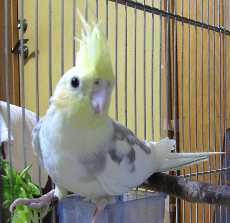 ほっぺがうっすらとオレンジ色なのがわかりますか?「パステルフェイス」といって、ちょっと変わり種なのです。「ななちゃん」はもっと濃いオレンジでした。あっちが本来のオカメちゃんのほっぺです。ちなみに「はなちゃん」は「ホワイトフェイス」といってやっぱり変わり種です。
