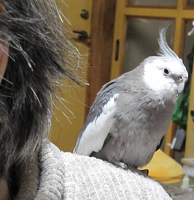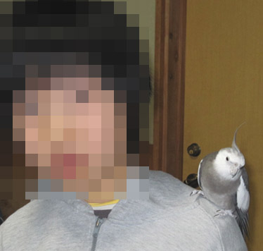 実はこれ、初めてなんですよ。はなちゃんが甥っ子ちゃんの肩の上に止まったのは。甥っ子ちゃんは街場育ちなので動物に触れ合う機会がなくて動物がコワイみたい。でも、興味はある。でもやっぱりコワイ。…という感じでしたが、はなちゃんもうちに来てもう3年も経つのでだいぶ慣れてきたのかな??「おばあちゃん」の肩の上にはなちゃんが止まっているのをすごく羨ましそうに見てたので止まらせてみました。はなちゃんが止まってくれて嬉しかったみたいだけど、はなちゃんよりも甥っ子ちゃんのほうが緊張してます(苦笑)。